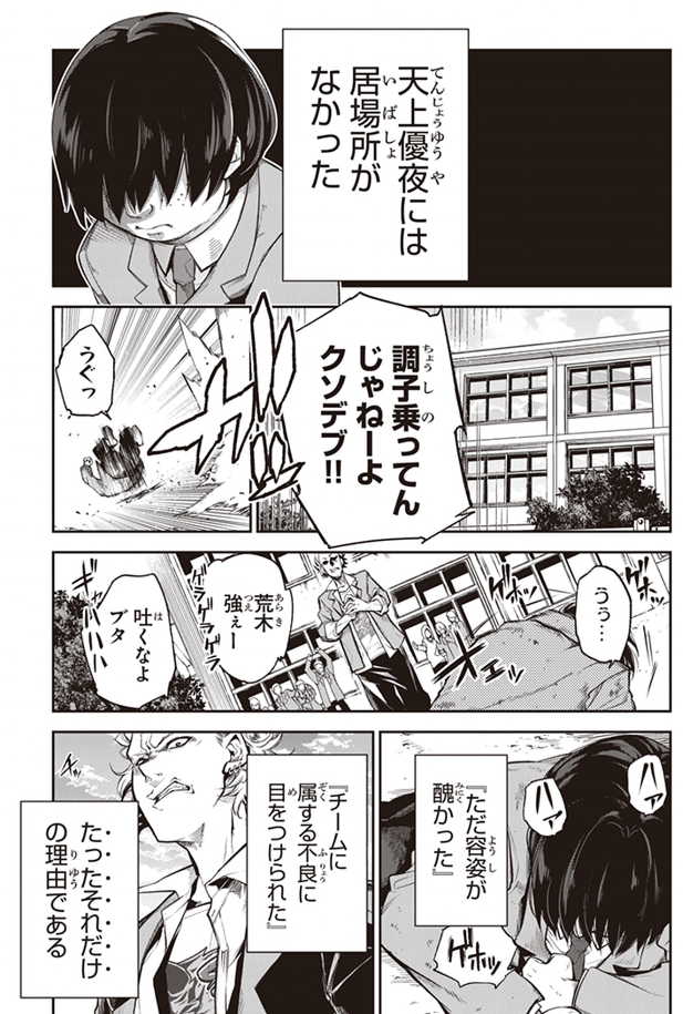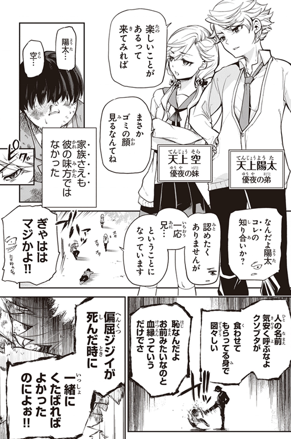 主人公の天上優夜(てんじょう・ゆうや)は、見た目を理由に学校でも家でも心ない扱いを受け続けてきた少年。読んでいて胸が痛くなるほど孤独で、誰にも頼れない状況から物語が始まります。